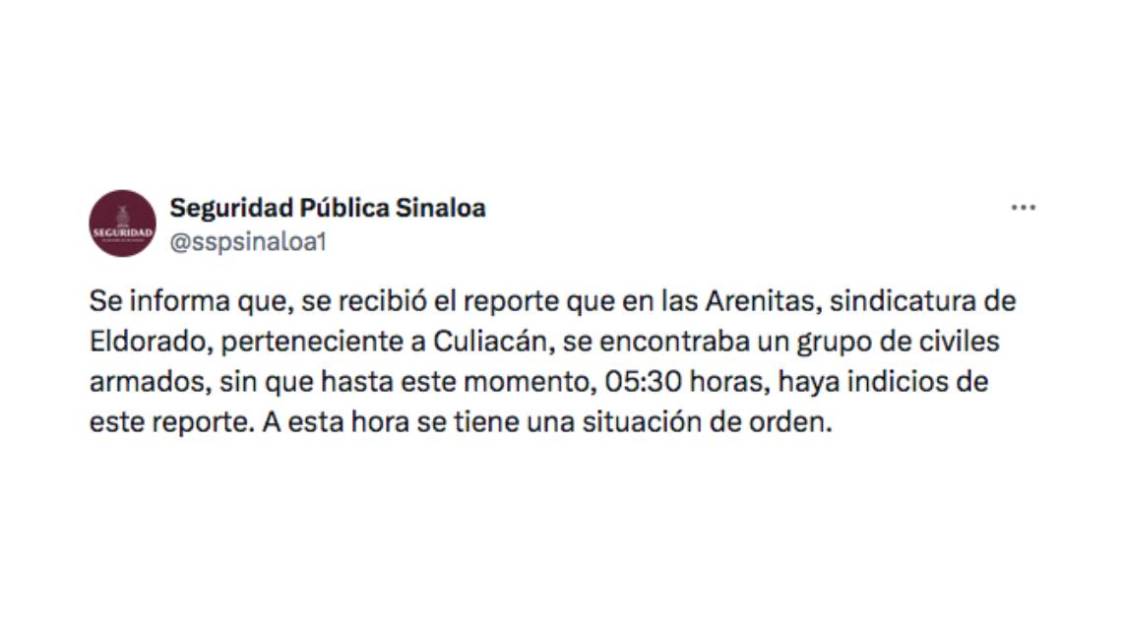 “Se informa que se recibió el reporte que en Las Arenitas, sindicatura de Eldorado, perteneciente a Culiacán, se encontraba un grupo de civiles armados, sin que hasta este momento, 05:30 horas, haya indicios de este reporte. A esta hora se tiene una situación de orden”, señala un informe difundido de la SSP estatal.