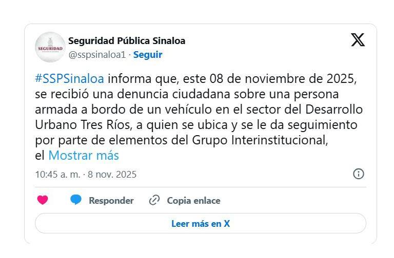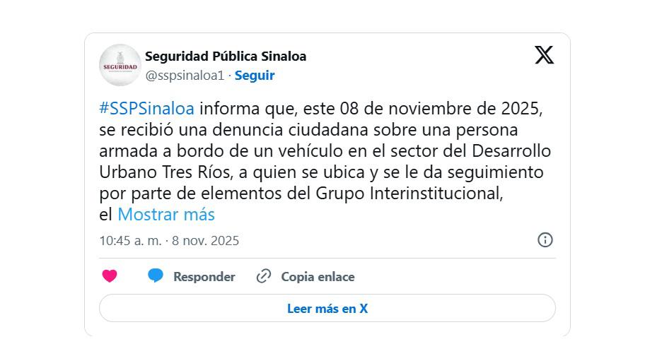 “La #SSPSinaloa informa que, este 08 de noviembre de 2025, se recibió una denuncia ciudadana sobre una persona armada a bordo de un vehículo en el sector del Desarrollo Urbano Tres Ríos, a quien se ubica y se le da seguimiento por parte de elementos del Grupo Interinstitucional, el cual efectuó disparos a la autoridad y chocó varios vehículos en el trayecto, logrando detenerlo en el sector de Infonavit, Humaya”, así refiere el comunicado.