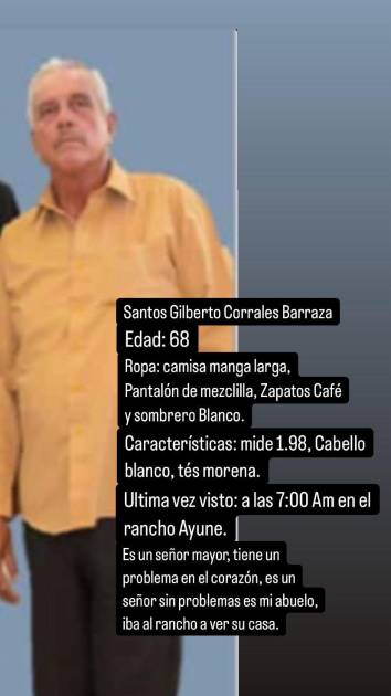 De acuerdo con la información, Santos Gilberto fue visto por última vez alrededor de las 7:00 horas, cuando se dirigía a revisar una propiedad en esa zona rural. Vestía una camisa de manga larga, pantalón de mezclilla, zapatos color café y un sombrero blanco. Mide aproximadamente 1.98 metros, es de tez morena y tiene el cabello canoso.