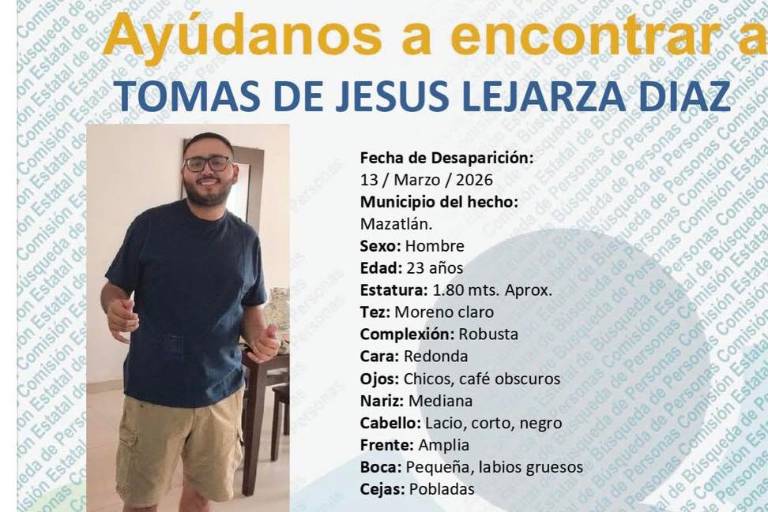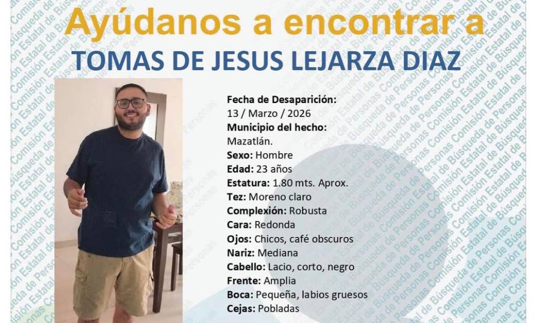 MAZATLÁN._ Tomás de Jesús Lejarza Díaz, de 23 años, cumplió 39 días de desaparecido en Mazatlán, luego de que la tarde del pasado viernes 13 de marzo fue visto por última vez en el fraccionamiento Sábalo Country.