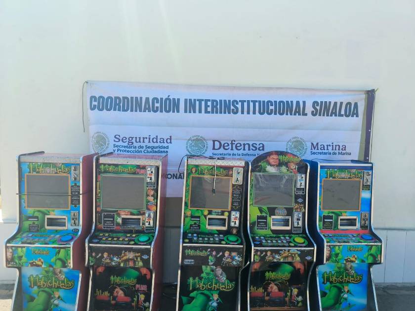 Lo anterior se llevó a cabo durante recorridos de vigilancia terrestre en el poblado “Los Potrerillos”, municipio de Badiraguato, donde se aseguraron cinco máquinas tragamonedas que se encontraban afuera de un domicilio.