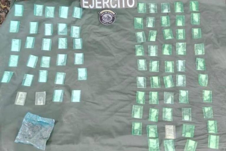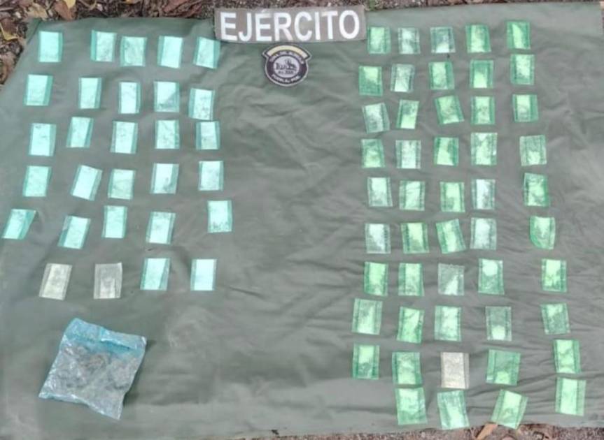 Según el reporte, los militares localizaron una bolsa que contenía 49 porciones de una sustancia con características similares al cristal, 29 dosis de probable cocaína y una dosis de marihuana.