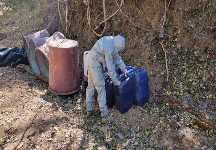 En el sitio se aseguraron 3 mil 450 litros de sustancias químicas, un reactor de síntesis orgánica y cinco condensadores.
