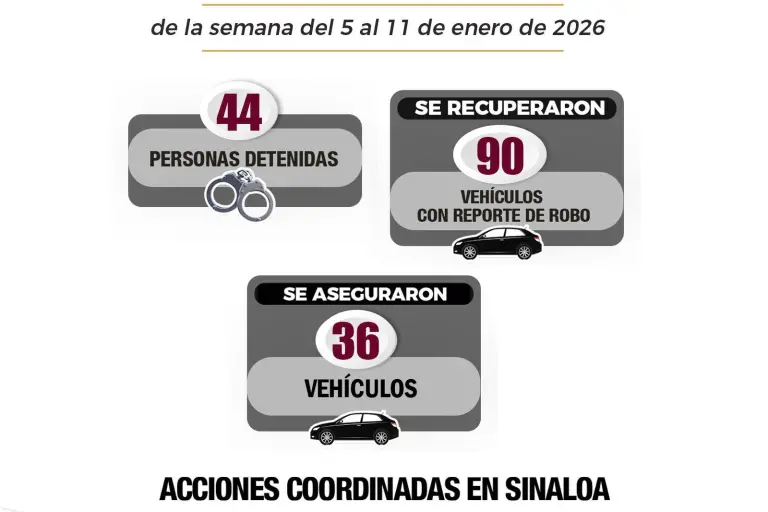 Del 5 al 11 de enero, autoridades detuvieron a 44 civiles y recuperaron 90 vehículos robados en Sinaloa