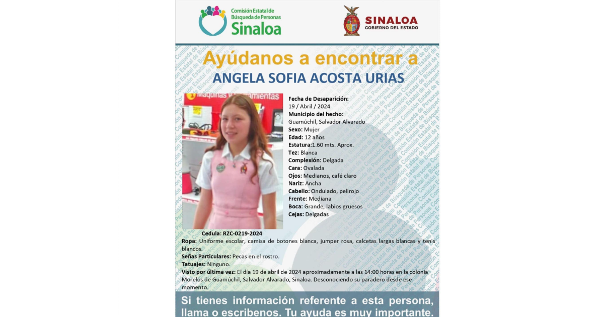 El 19 de abril de 2024, aproximadamente a las 14:00 horas, fue el último día que se supo de Ángela Sofía Acosta Urías, una adolescente de 12 años, en la colonia Morelos de Guamúchil, Salvador Alvarado.
