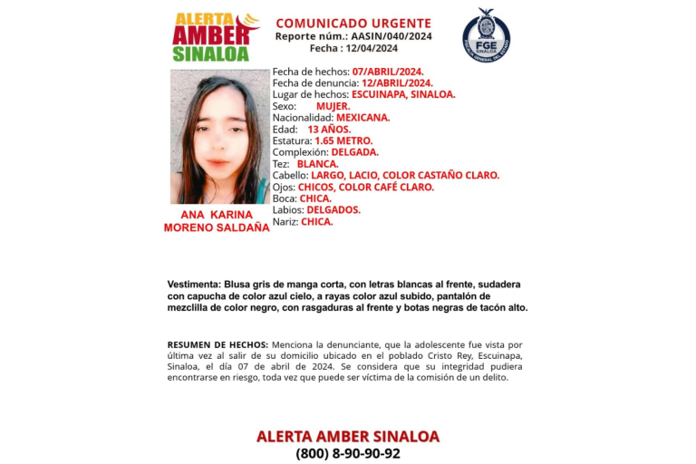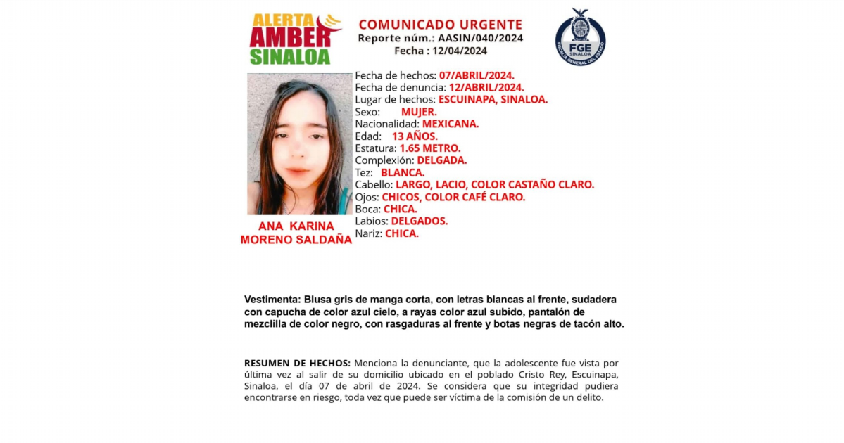 Ana Karina Moreno Saldaña, una adolescente de 13 años, fue vista por última vez el 7 de abril de 2024 al salir de su domicilio ubicado en el poblado Cristo Rey, Escuinapa y desde entonces no se conoce su paradero.