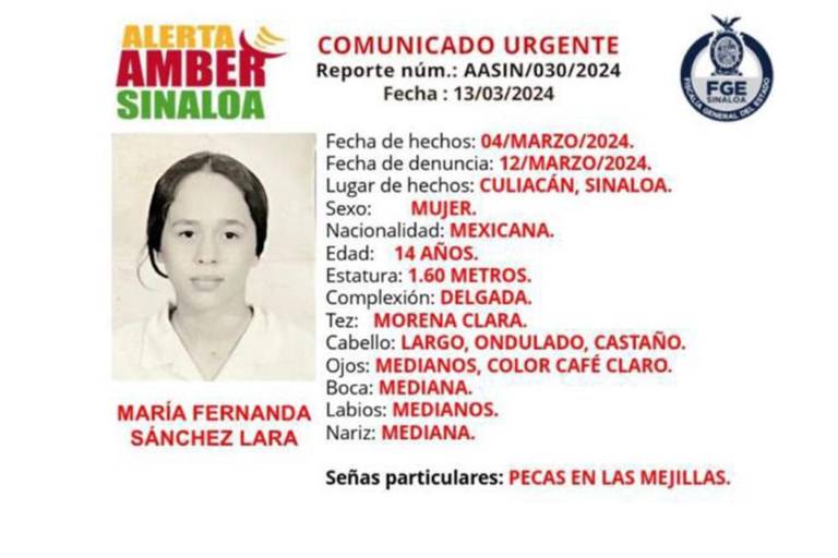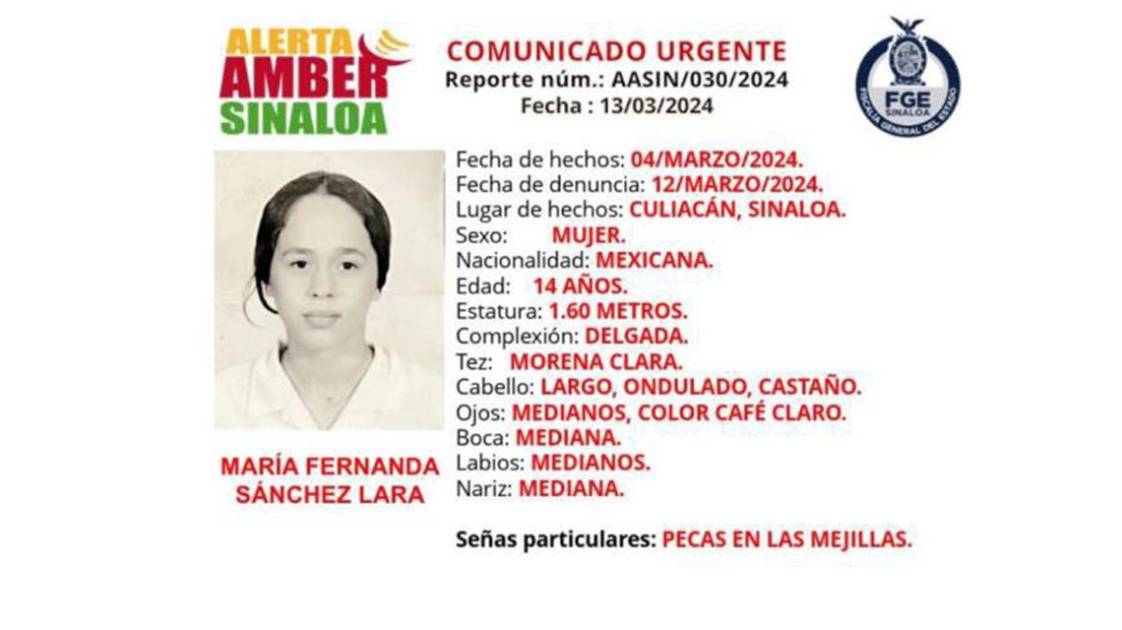 El 4 de marzo de 2024, María Fernanda Sánchez Lara, una adolescente de 14 años, salió de su domicilio ubicado en el Fraccionamiento Alameda, Culiacán, y hasta la fecha se desconoce su paradero.