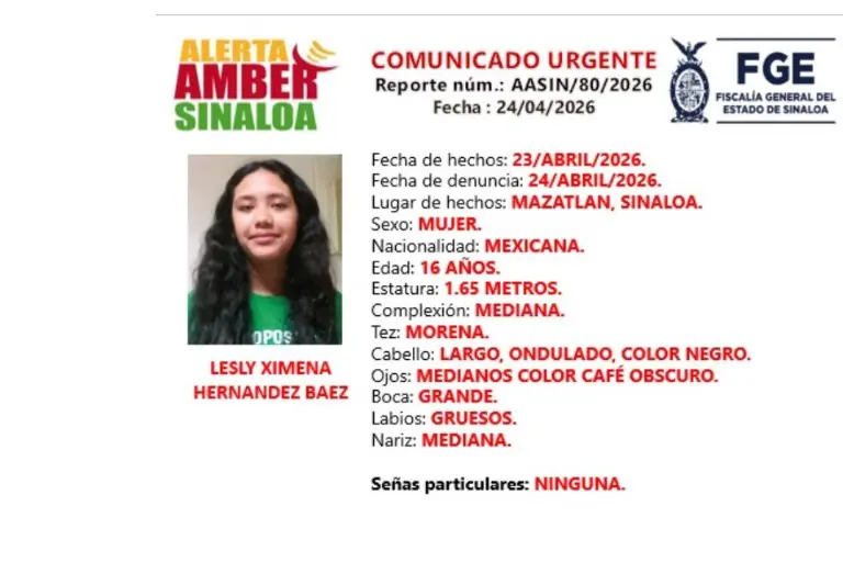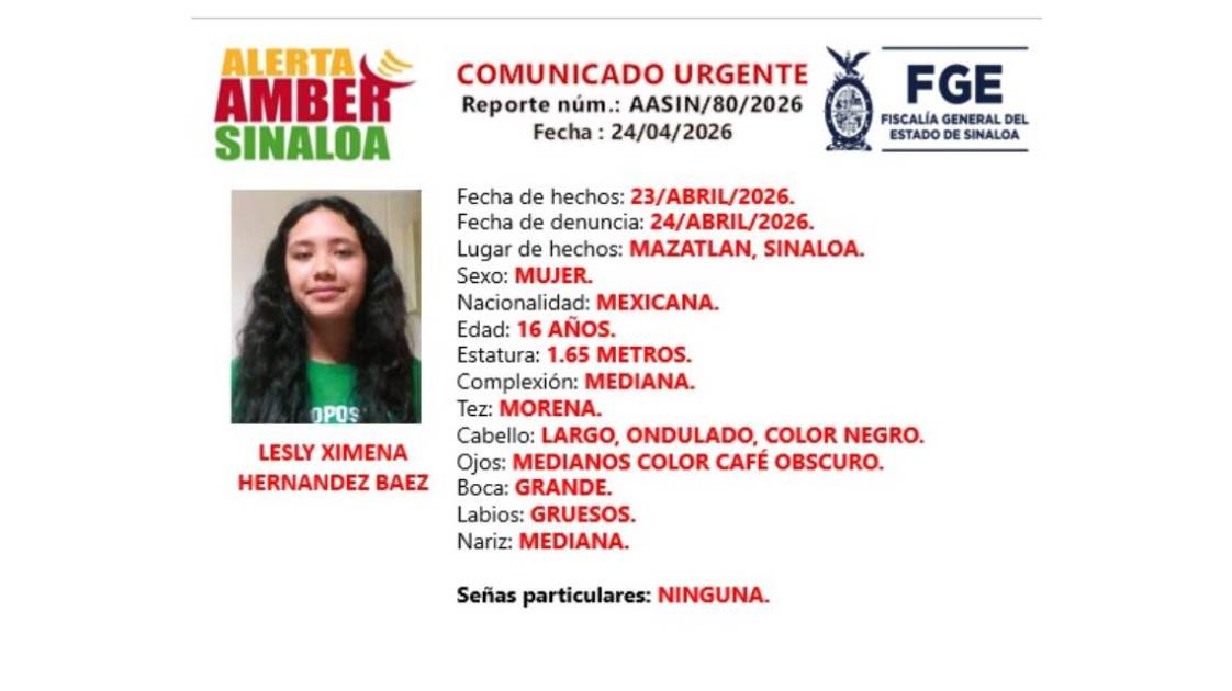 La Fiscalía General del Estado de Sinaloa giró una ficha de búsqueda Alerta Amber tras la desaparición de Lesly Ximena Hernández Baez, adolescente de 16 años extraviada en el puerto de Mazatlán.