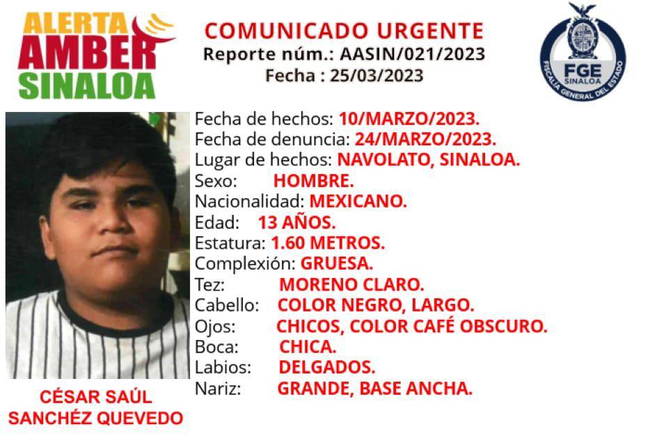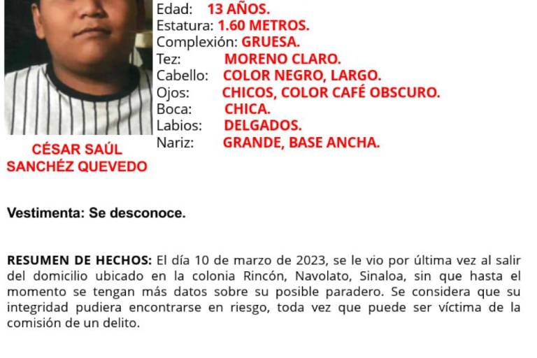 CULIACÁN._ Un menor de 13 años y vecino de Navolato fue reportado como desaparecido por la Fiscalía General de Sinaloa.