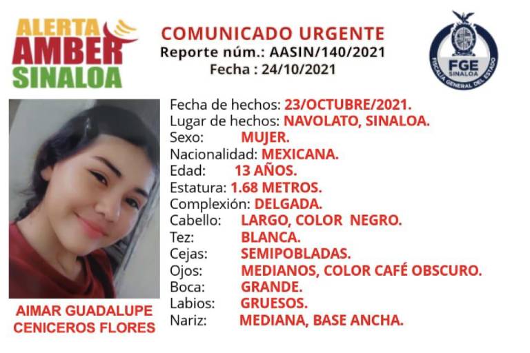 La Fiscalía General de Sinaloa solicita la colaboración ciudadana para localizar a Aimar Guadalupe Ceniceros Flores, de 13 años de edad.
