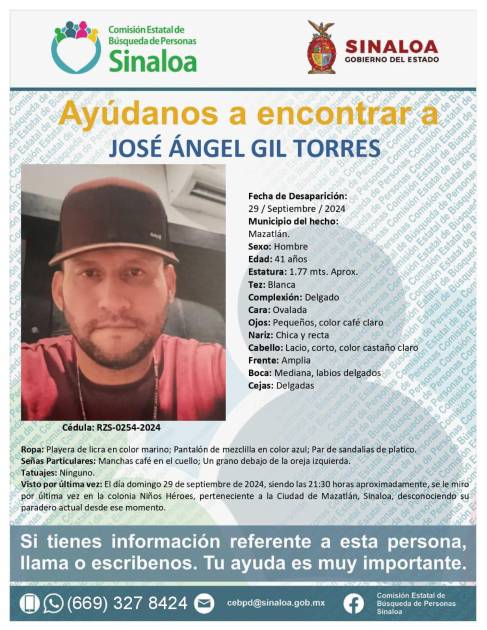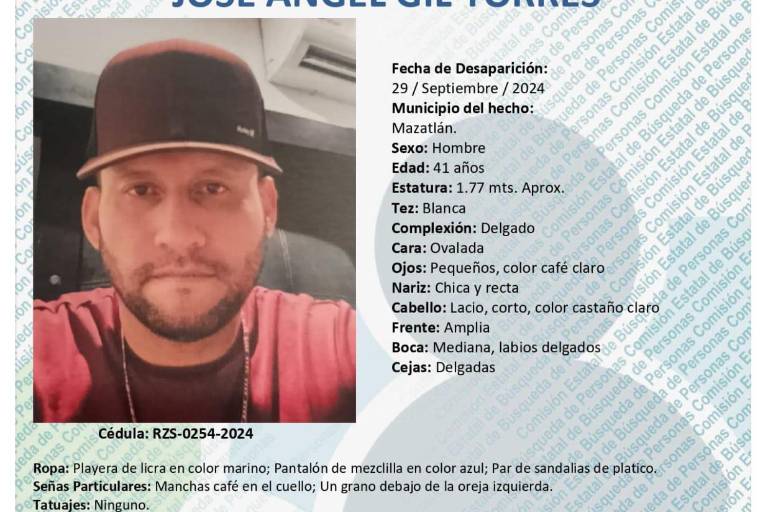 MAZATLÁN._José Ángel Gil Torres se encuentra desaparecido desde la noche del pasado 29 de septiembre de 2024, cuando se le vio por última vez en la Colonia Niños Héroes, de Mazatlán.
