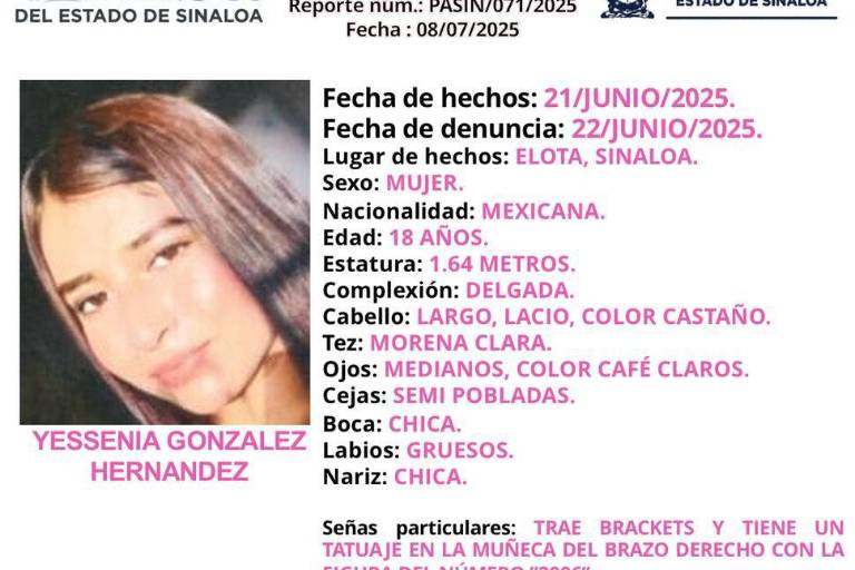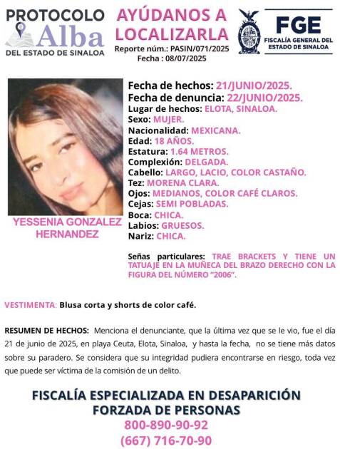 ELOTA. _ La Fiscalía General del Estado (FGE), activó el Protocolo Alba para la localización de Yessenia “N”, una joven de 18 años desaparecida desde el 21 de junio de 2025 en la playa Ceuta, ubicada en el municipio de Elota.