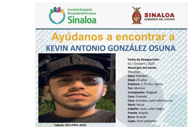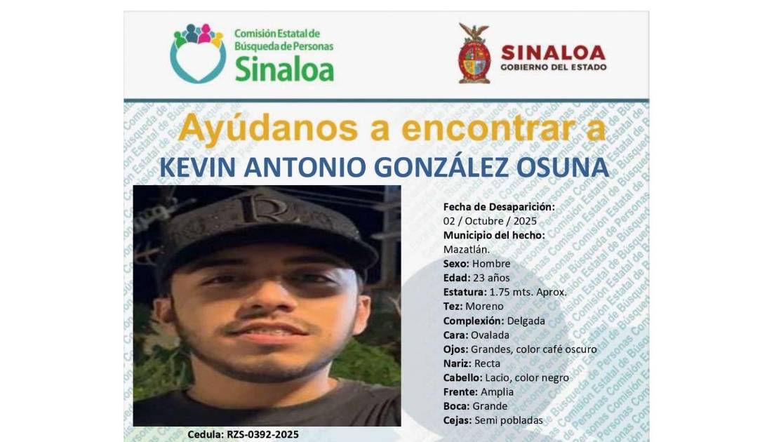 MAZATLÁN._ El joven Kevin Antonio González Osuna se encuentra desaparecido desde las 21:00 horas del pasado jueves 2 de octubre, cuando se encontraba en la colonia Ampliación 20 de Noviembre.