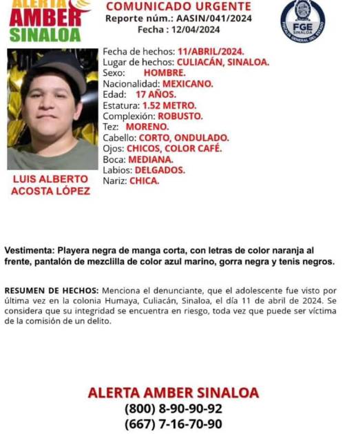 CULIACÁN._ El 11 de abril de 2024, fue el último día que se le vio al adolescente de 17 años Luis Alberto Acosta López, en la colonia Humaya, Culiacán y desde entonces se desconoce su paradero.
