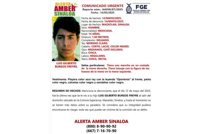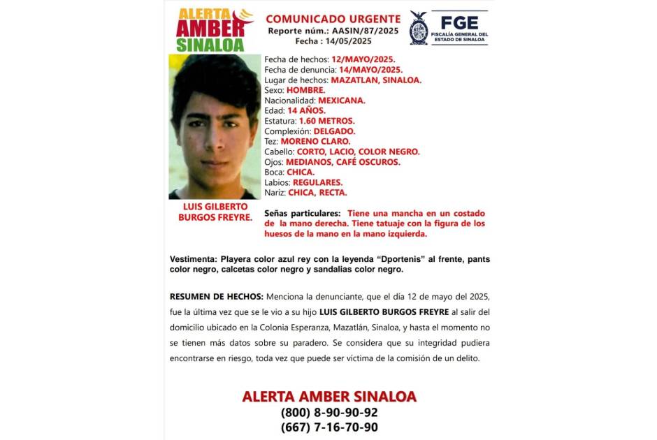 Por su desaparición, la Fiscalía General del Estado de Sinaloa activó la Alerta Amber con el número de reporte AASIN/87/2025. Este miércoles 14 de mayo sus familiares interpusieron la denuncia.