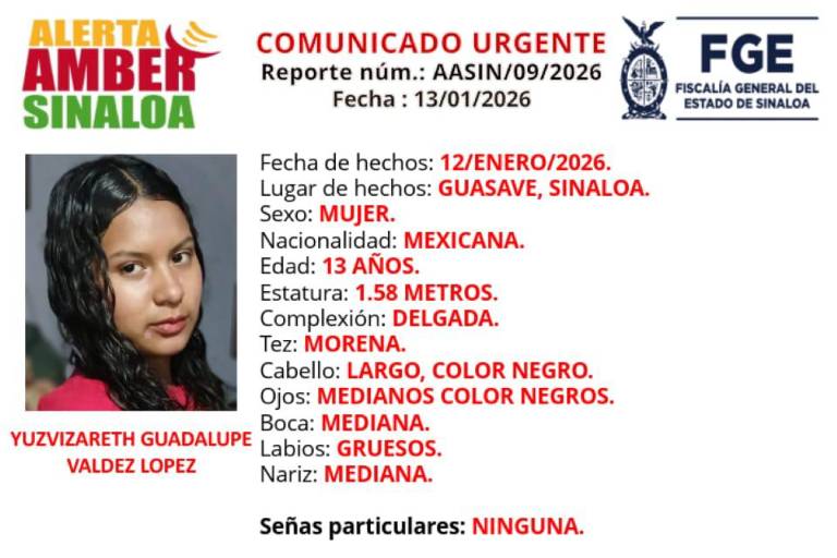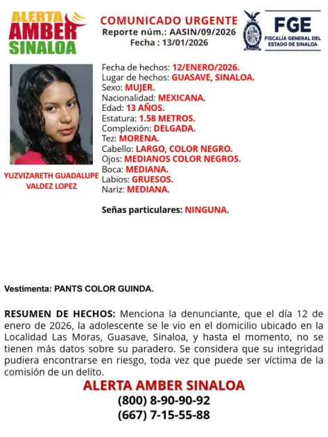 La Fiscalía General del Estado de Sinaloa (FGE) activó la Alerta Amber para la localización Yuzvizareth Guadalupe Valdez López, de 13 años de edad, quien fue vista por última vez el día de ayer en el municipio de Guasave.