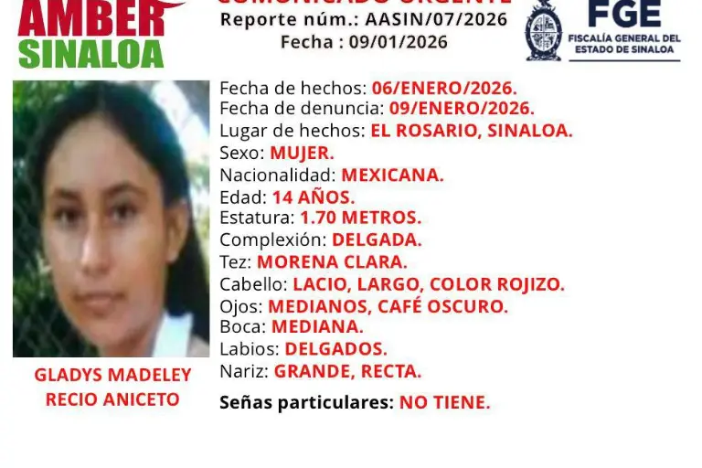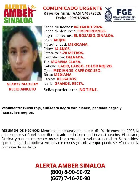 ROSARIO._ Las autoridades estatales emitieron la Alerta Amber para la búsqueda de Gladys Madeley Recio Aniceto, una adolescente de 14 años que desapareció hace tres días en el municipio de El Rosario y hasta el momento se desconoce su paradero.