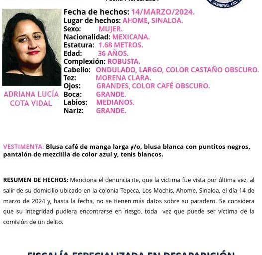 La última vez que se le vio a Adriana Lucía Cota Vidal, una mujer de 36 años, fue el al salir de su domicilio, ubicado en la colonia Tepecha, Los Mochis, Ahome, el día 14 de marzo de 2024.