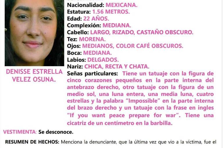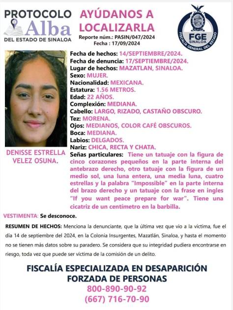 MAZATLÁN._ La Fiscalía General de Sinaloa, a través del Protocolo Alba del estado, emitió reporte para localizar a la joven Denisse Estrella Velez Osuna, quien se encuentra desaparecida desde el pasado sábado 14 de septiembre, cuando fue vista por última vez en la Colonia Insurgentes, en Mazatlán.