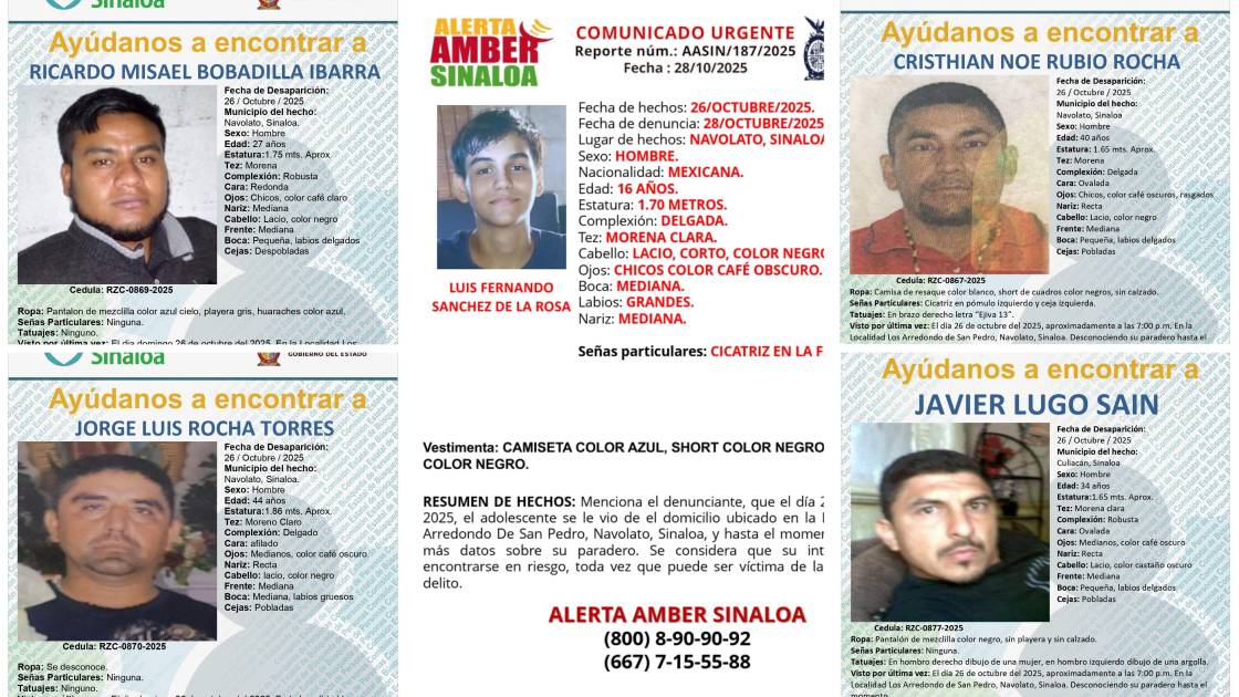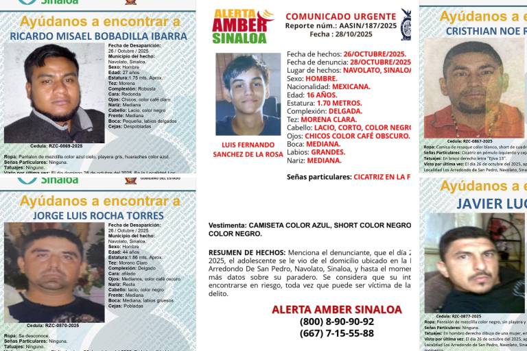 La Comisión Estatal de Búsqueda emitió las fichas correspondientes para los adultos identificados como Jorge Luis Rocha Torres, de 44 años; Cristhian Noé Rubio Rocha, de 40; Ricardo Misael Bobadilla Ibarra, de 27, y Javier Lugo Saín, de 34.