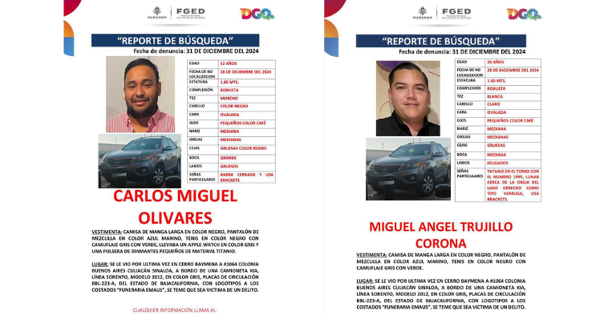 La Fiscalía General del Estado de Durango giró ficha de búsqueda de dos hombres reportados como desaparecidos en la colonia Buenos Aires, en Culiacán, el pasado 28 de diciembre.