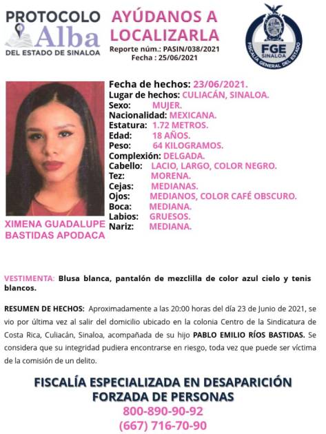 Las autoridades de la Fiscalía General del Estado de Sinaloa señalan que la integridad física de la joven madre y su hijo podrían estar en riesgo, debido a que pudieran ser víctima de la comisión de un delito.