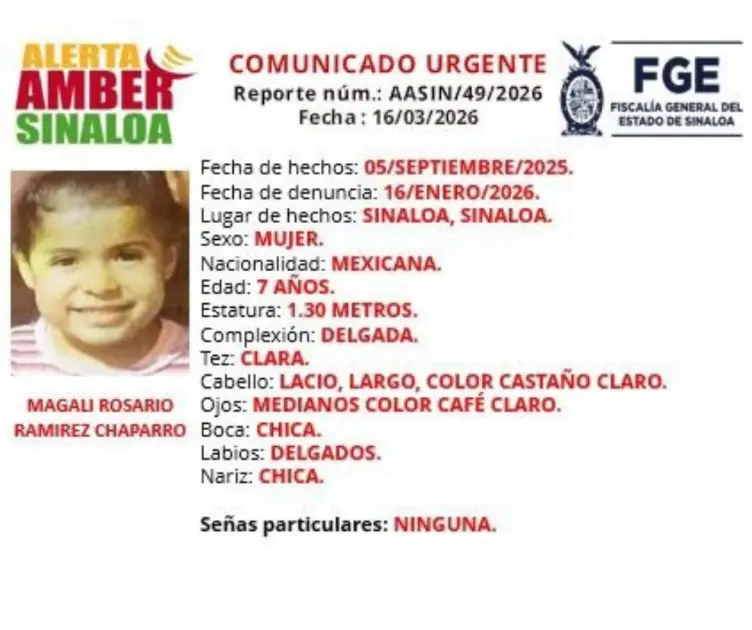 SINALOA. _ La Fiscalía General del Estado de Sinaloa activó una ficha de búsqueda Alerta Amber para localizar a la menor Magali Rosario Ramírez Chaparro, de 7 años, quien fue vista por última vez el 5 de septiembre de 2025.