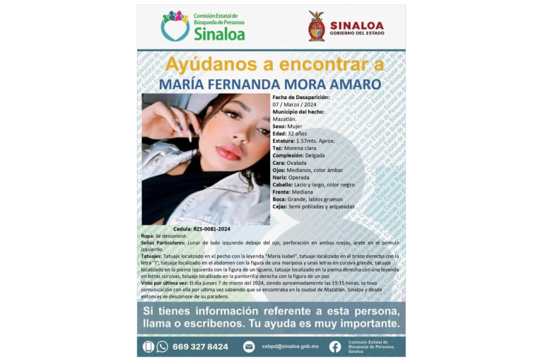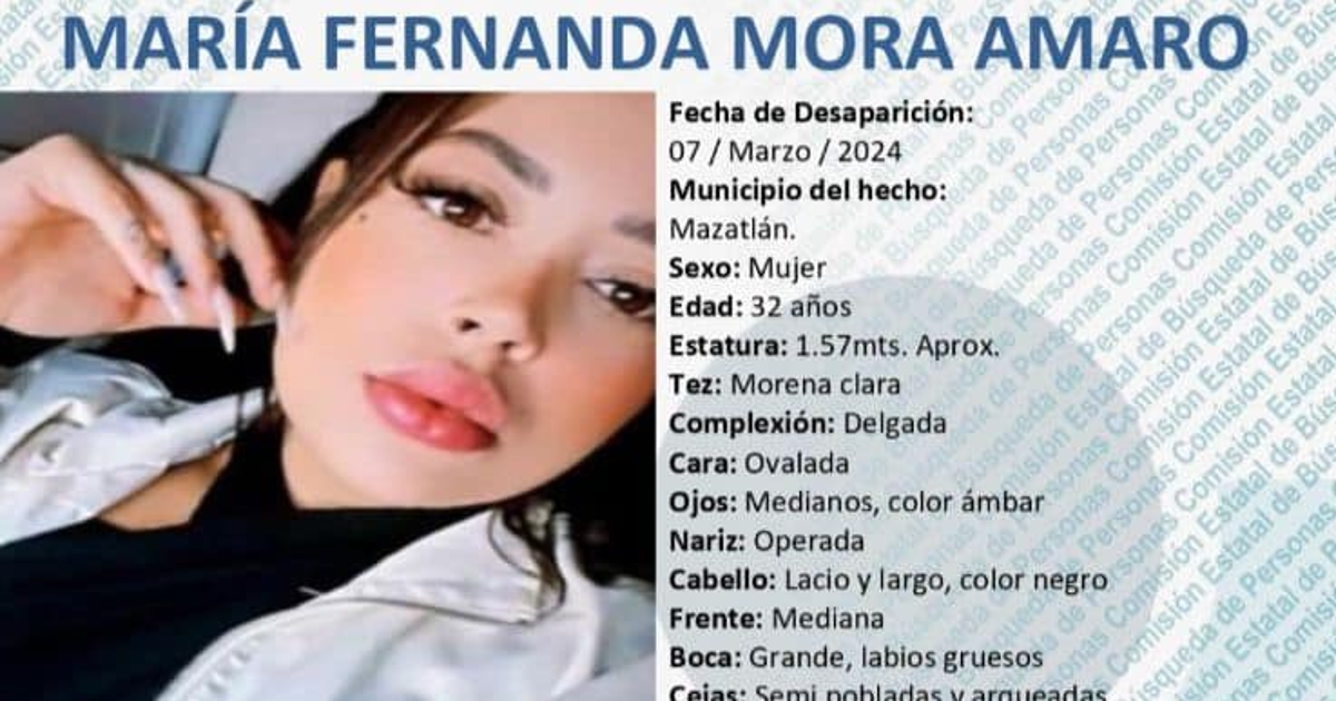 El jueves 7 de marzo de 2024, en Mazatlán Sinaloa, fue la última vez que se tuvo comunicación con María Fernanda Mora Amaro, una mujer de 32 años y desde entonces se desconoce su paradero.