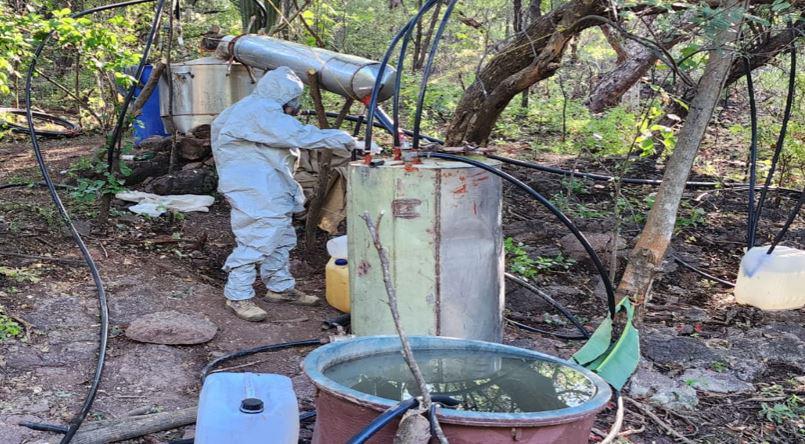 De acuerdo con información de la Secretaría de Seguridad Pública de Sinaloa (SSPE), en el lugar fueron encontrados un reactor de 250 litros, un condensador, dos destiladoras metálicas, una tina de color café, nueve sacos de sosa cáustica con un peso total de 225 kilos, tres bidones con 125 litros de metilamina y tres tambos con 600 litros de alcohol etílico.
