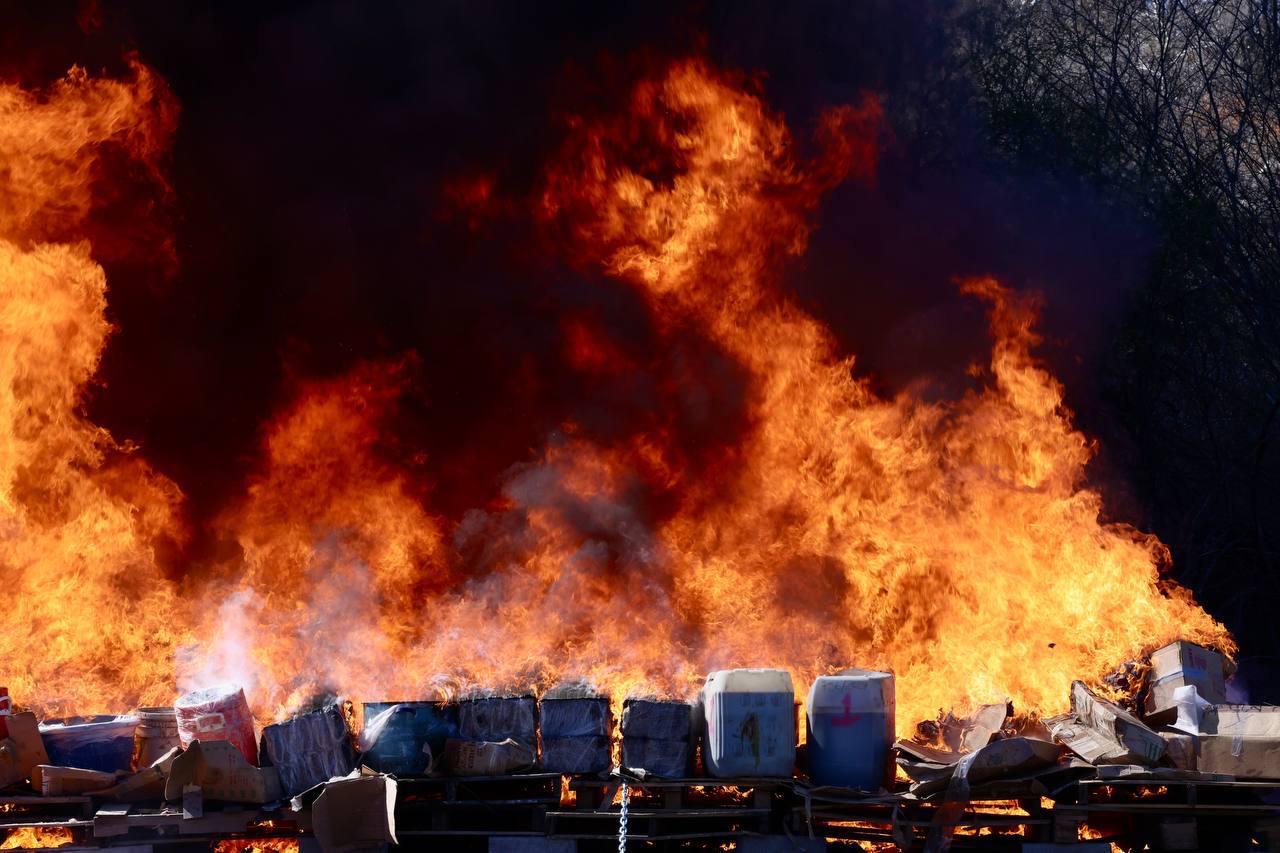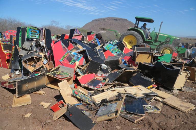 En total fueron destruidas 796 maquinitas tragamonedas, 179 objetos de delito como equipo táctico y tumba drones, así también, más de 4 mil 208 kilogramos y mil 163 litros de diversos narcóticos, entre ellos metanfetamina, cocaína, mariguana, heroína, plantas de amapola y diversas sustancias químicas, en una destrucción llevada a cabo por la Fiscalía General de la República, en Culiacán.