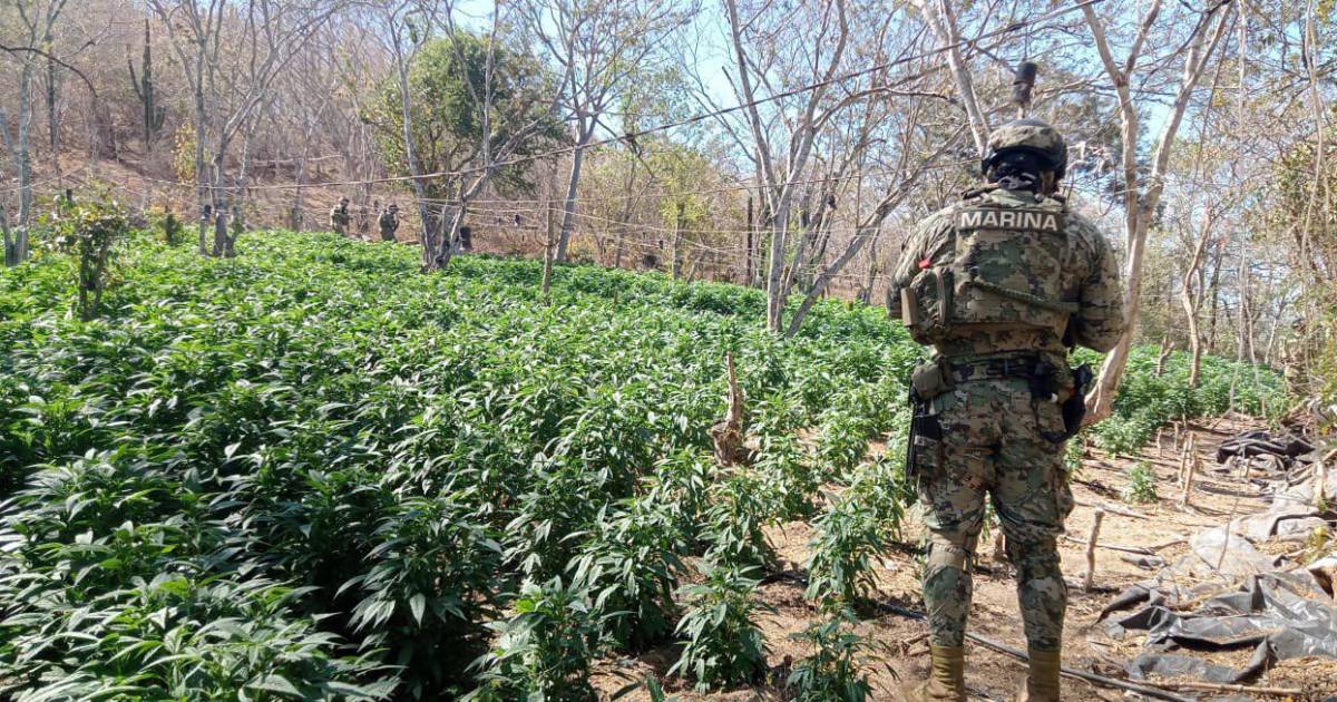 La corporación dio a conocer que el hallazgo ocurrió tras una serie de sobrevuelos y recorridos en el poblado, por lo que personal de la Marina localizó un primer plantío de mil 710 metros cuadrados, donde fueron destruidos 5 mil 464 kilogramos de mariguana.