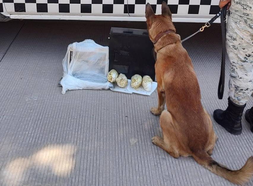 Al olfatear una caja de cartón, el ejemplar canino mostró un cambio de conducta, seguido por la indicación positiva a un aroma para el que fue entrenado, indicando la posible existencia de alguna sustancia ilícita.