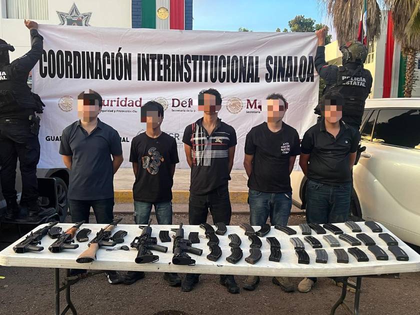CULIACÁN._ Cinco hombres en posesión de armas de fuego, municiones y vehículos con reporte de robo, fueron detenidos en la zona norte de Culiacán; dos de ellos son menores de edad.