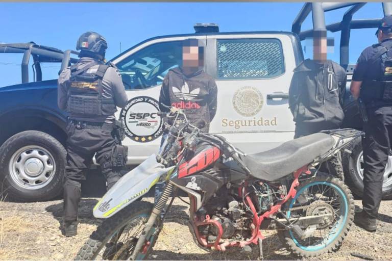 Al llegar al entronque con el poblado Barrón, las autoridades localizaron un vehículo de carga incendiado, y al ampliar el operativo, encontraron a dos civiles que circulaban en una motocicleta similar a la señalada en la denuncia y con vestimenta igual a la reportada.
