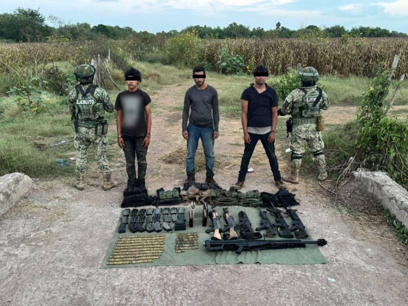 En otra acción, en el poblado Abocho, también en Elota, efectivos del Ejército Mexicano detuvieron a tres personas en posesión de un fusil Barrett, seis armas largas, 27 cargadores, 645 cartuchos y cinco chalecos tácticos.