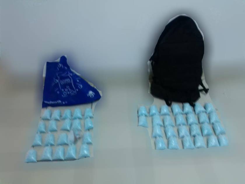 Por lo que le realizaron una revisión con previa autorización no encontrando objeto ilícito entre sus ropas pero en la mochila que portaba quien dijo llamarse, Samuel “N” de 43 años de edad, se localizaron 26 envoltorios de polietileno, que contienen diversas pastillas color azul celeste.