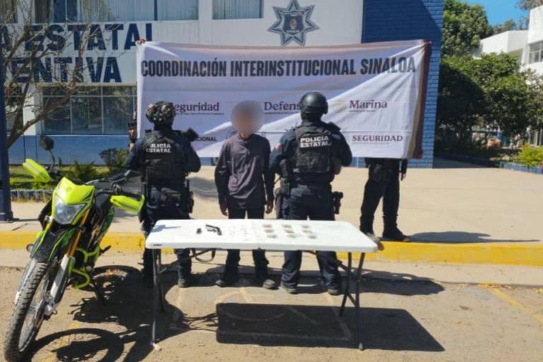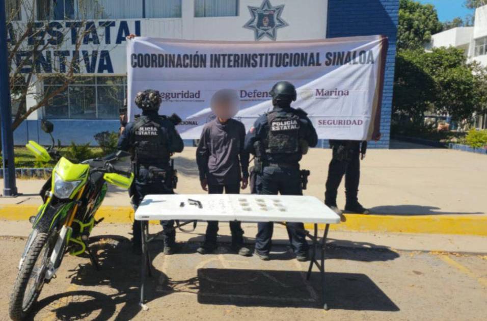 Un menor de edad fue detenido por elementos de seguridad pública en posesión de un arma de fuego, presunta droga y una motocicleta con reporte de robo durante un operativo realizado en Culiacán.