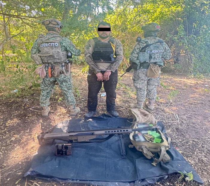 ELOTA. _ Elementos del Ejército Mexicano detuvieron a un civil y aseguraron un arsenal de alto poder, incluido un fusil Barrett, después de repeler dos agresiones armadas registradas en el municipio de Elota.