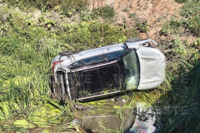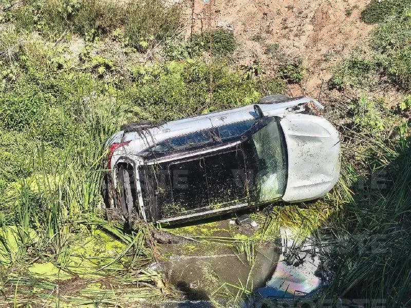 La velocidad y la falta de pericia provocaron que la unidad se proyectara contra el puente, derribando el barandal metálico de contención. Tras el fuerte impacto, el vehículo cayó directamente al dren conocido como “Bayoneta”, que corre paralelo a la rúa federal, terminando completamente volcado con las llantas hacia arriba.