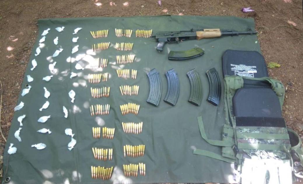 Durante reconocimientos terrestres en Albaterra, la fuerza militar aseguró un arma larga, cinco cargadores, 338 cartuchos, un chaleco táctico, dos placas balísticas y 30 dosis de cocaína.