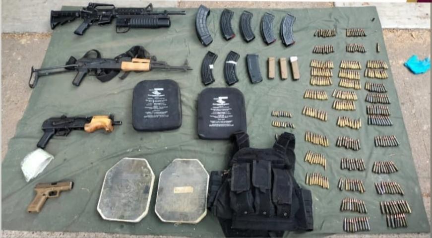 En el sitio también se localizó un vehículo con reporte de robo, tres armas largas, un aditamento lanzagranadas, un arma corta, 11 cargadores, 362 cartuchos útiles, un chaleco táctico, cuatro placas balísticas y 15 mil 800 pesos en efectivo.