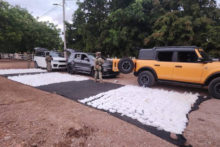 Durante la inspección, soldados localizaron y aseguraron una camioneta Range Rover blanca, una Grand Cherokee gris y un vehículo amarillo. En su interior se encontraron 23 bolsas, ocho bultos y una caja, que contenían un total aproximado de 746 kilogramos de metanfetamina.