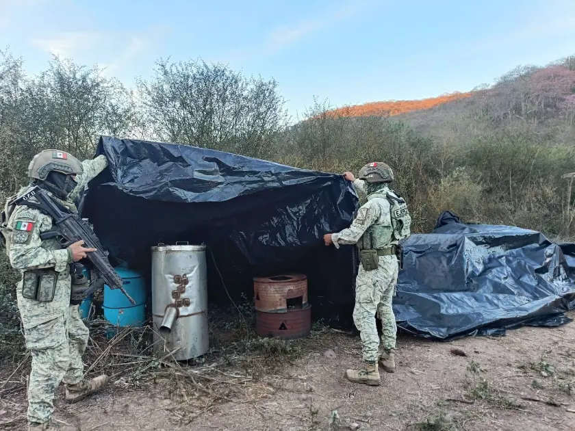 El personal castrense localizó en una parcela diversos productos químicos y metanfetamina ya procesada, los cuales se encontraban ocultos bajo una lona. Tras el hallazgo, los efectivos militares procedieron al acordonamiento del área para resguardar los indicios conforme a los protocolos de seguridad.
