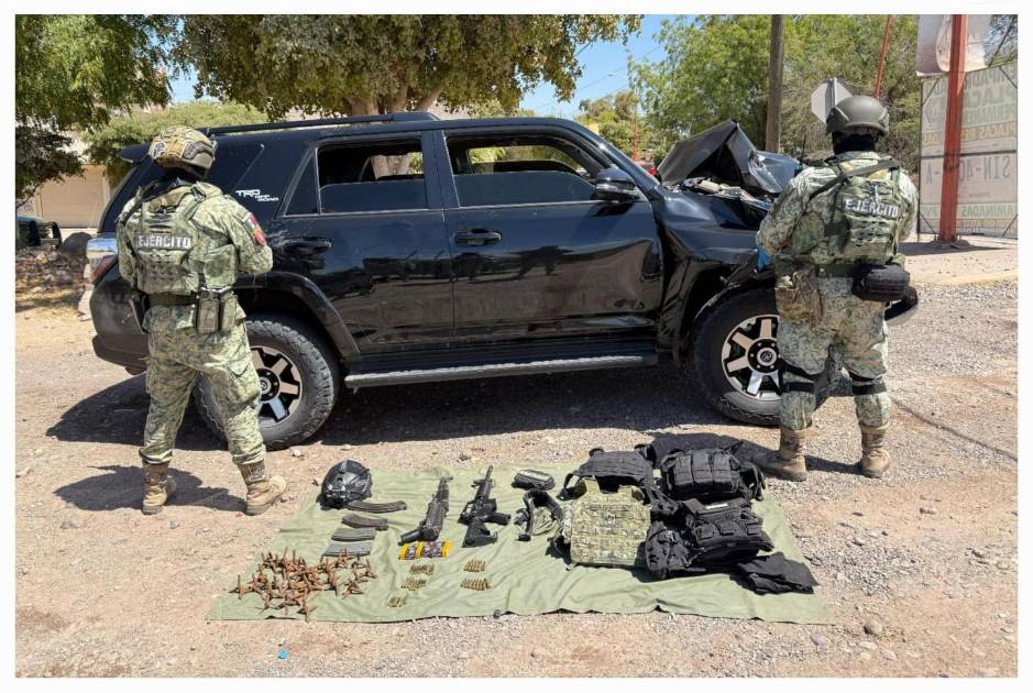 Ejército asegura vehículo, armas, equipo táctico y puntas de acero en Guamúchil
