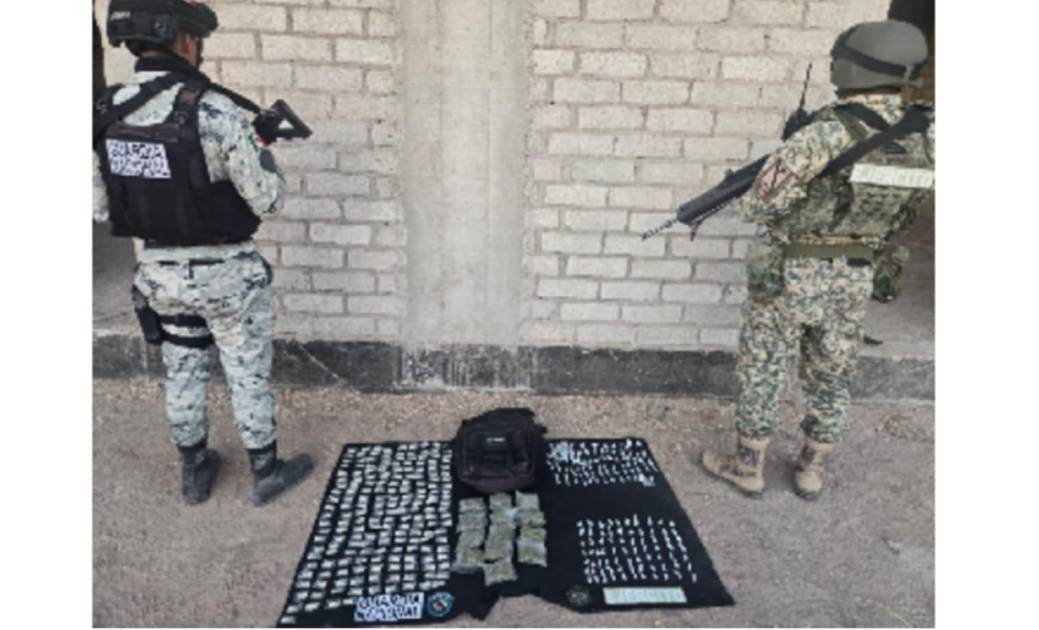 Durante la acción, los elementos castrenses localizaron 187 dosis de cristal, 159 dosis de cocaína y 13 dosis de mariguana.
