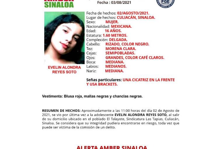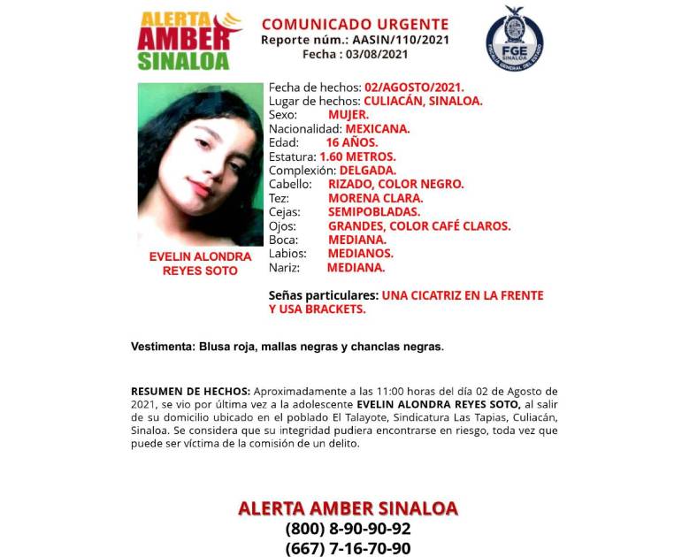 La Fiscalía General de Sinaloa solicita la colaboración ciudadana para localizar a Evelin Alondra Reyes Soto de 16 años de edad, quien fue vista por última vez el día 02 de agosto a las 11:00 horas cuando salió de su domicilio ubicado en el poblado El Tayalote, sindicatura de Las Tapias, de la ciudad de Culiacán.