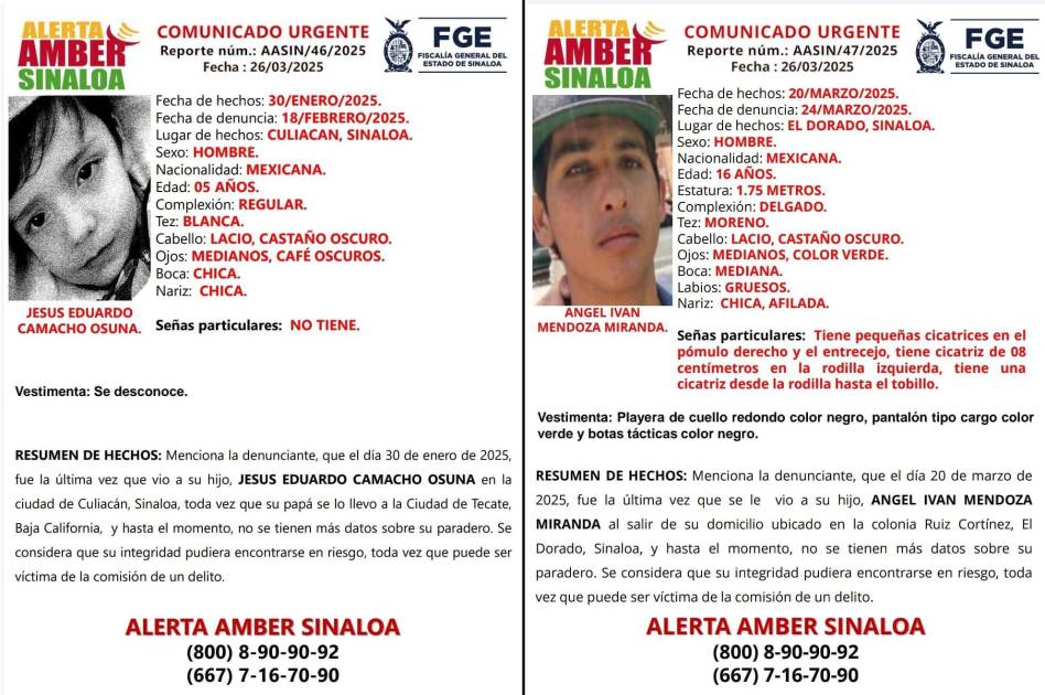 Dos Alertas Amber fueron emitidas por la Fiscalía General de Sinaloa para la localización de Jesús Eduardo, de 5 años, y Ángel Iván, de 16 años, quienes desaparecieron en distintas circunstancias en la entidad.