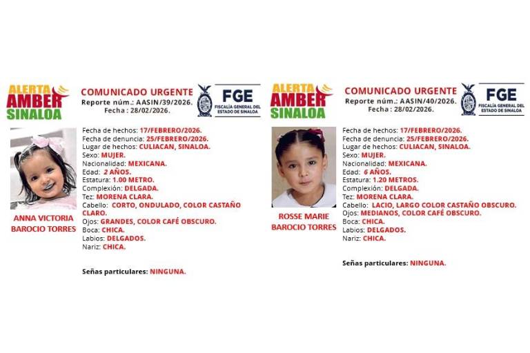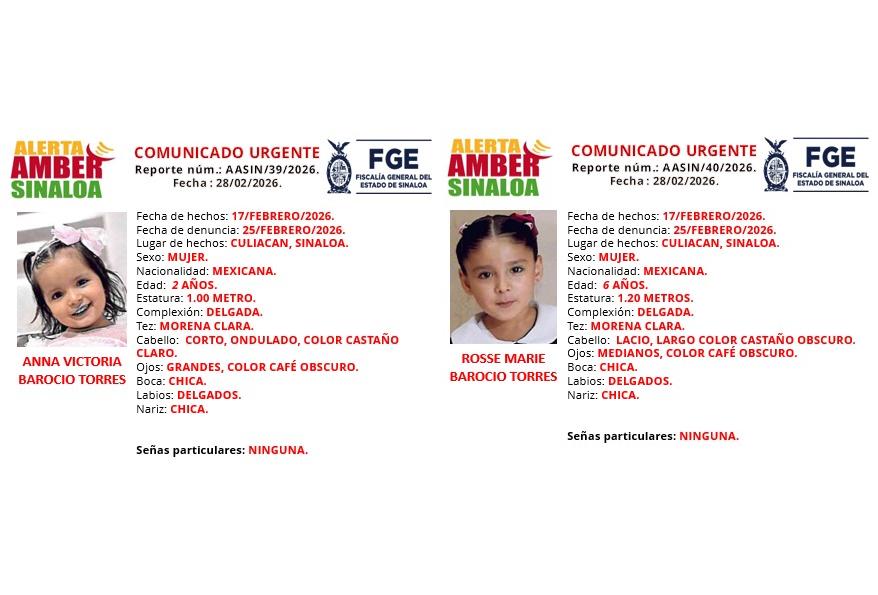 La Fiscalía General del Estado de Sinaloa giró protocolos de búsqueda tras el reporte de extravío de las hermanas Anna Victoria y Rosse Marie Barocio Torres, vistas por última vez el pasado 17 de febrero en Culiacán.
