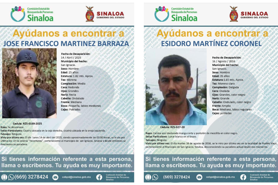 CULIACÁN. _ La Comisión Estatal de Búsqueda de Personas del Estado de Sinaloa emitió una ficha de búsqueda para localizar a José Francisco Martínez Barraza, de 25 años de edad y a Esidoro Martínez Coronel, de 35 años.