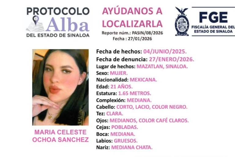 La Fiscalía General del Estado emitió ficha de búsqueda bajo Protocolo Alba por la desaparición de María Celeste Ochoa Sánchez, extraviada hace 7 meses en Mazatlán.
